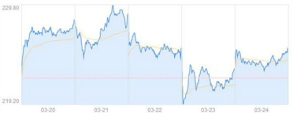就在騰訊財報發(fā)布的當(dāng)天,股票就開始下跌,當(dāng)日收盤時股價為225.2港元,下跌了3.6港幣,跌幅為1.57%。第二天繼續(xù)下跌,開盤時僅為221.80港元,收盤時雖回升至223,但還是比前一個交易日下跌了2.2港元,跌幅為0.98%。連跌兩天之后,終于在24日止跌回升,收盤時達到225.2,比前一個交易日上漲了0.99%。
