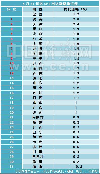 4月31省區(qū)的CPI漲幅排行榜。制表人:宋雅靜
