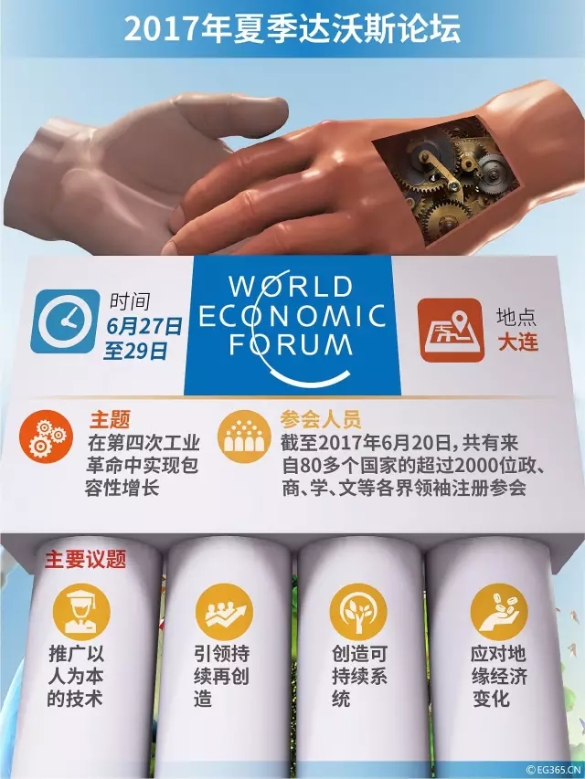 本次會議主題為“在第四次工業(yè)革命中實現(xiàn)包容性增長”。在為期3天的年會中,來自全球80多個國家的2000多位嘉賓將圍繞推廣以人為本的技術(shù)、引領(lǐng)持續(xù)再創(chuàng)造、創(chuàng)造可持續(xù)系統(tǒng)、應(yīng)對地緣經(jīng)濟變化等四個議題展開200多場會議討論,為世界經(jīng)濟實現(xiàn)可持續(xù)發(fā)展提出具有啟發(fā)性的建議。