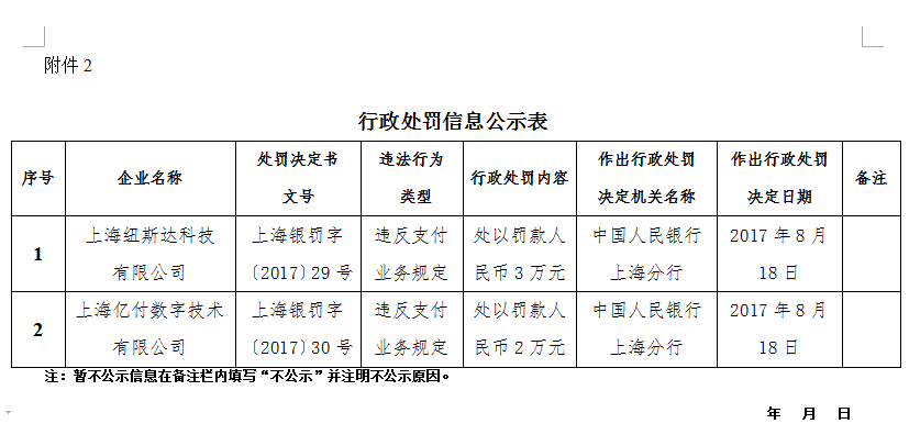 其中,上海紐斯達科技有限公司因違反支付業(yè)務規(guī)定,被處以罰款人民幣3萬元,作出處罰決定的日期為2017年8月18日。