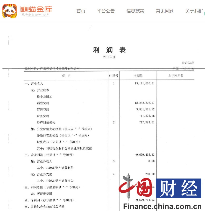 中國網財經記者發(fā)現,在亮眼的成交數據背后,熊貓金庫卻面臨虧損。據其官方網站披露的《廣東熊貓鎮(zhèn)投資管理有限公司2016年度審計報告》(以下簡稱“審計報告”)顯示,2016年熊貓金庫營業(yè)收入為1311.11萬元,凈利潤為-967.96萬元。