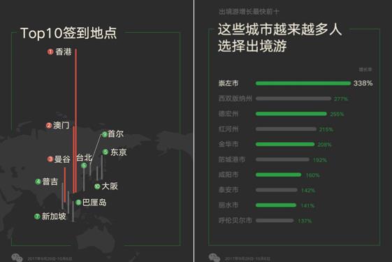 但隨著收入的提升和消費(fèi)升級,出境游已成為越來越多二三線城市居民的度假選擇,微信的統(tǒng)計(jì)數(shù)據(jù)顯示,廣西、云南、陜西等省份的居民選擇出境旅游的人數(shù)也在快速上升,其中,廣西省崇左市微信用戶的出境人數(shù)增長率達(dá)338%。
