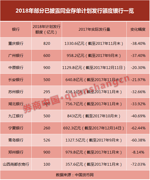 從目前已公布的銀行2018同業(yè)存單發(fā)行計劃來看,實際備案發(fā)行額度已經(jīng)較2017年大幅下滑。