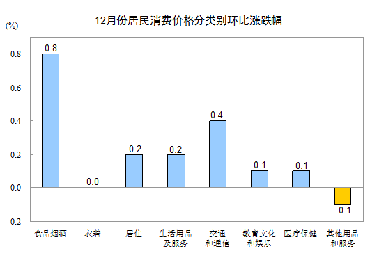 12月份,其他七大類價格環(huán)比五漲一降一平。其中,交通和通信價格上漲0.4%,居住、生活用品及服務(wù)價格均上漲0.2%,教育文化和娛樂、醫(yī)療保健價格均上漲0.1%;其他用品和服務(wù)價格下降0.1%;衣著價格持平。