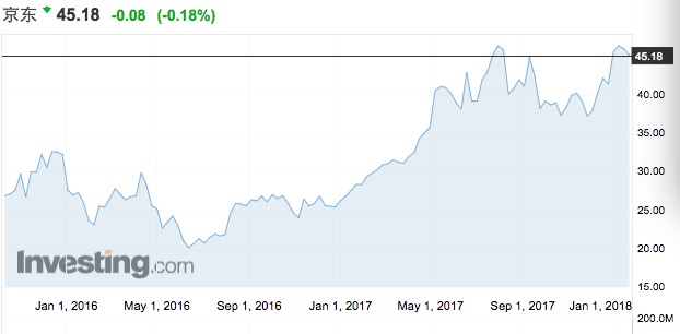2017年7月前后,京東迎來(lái)了股價(jià)的歷史高點(diǎn),在過(guò)去一年累計(jì)上漲超過(guò)九成,2017年6月25日收市時(shí)的市值是609.6億美元,距離中國(guó)市值第三的互聯(lián)網(wǎng)公司百度(617.9億美元)僅差8.3億美元。同年5月8日,京東宣布2017年一季度實(shí)現(xiàn)非美國(guó)通用會(huì)計(jì)準(zhǔn)則下(Non-GAAP)凈利潤(rùn)14億元人民幣,之前連續(xù)虧損了11年。