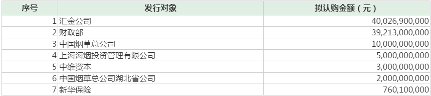 從各發(fā)行對象來看,除去匯金公司和財政部,其余的發(fā)行對象中,上海海煙投資管理有限公司與中維資本兩家均為中國煙草集團背景公司,再加上中國煙草總公司、中國煙草總公司湖北省公司,“中煙系”法人占到四席。