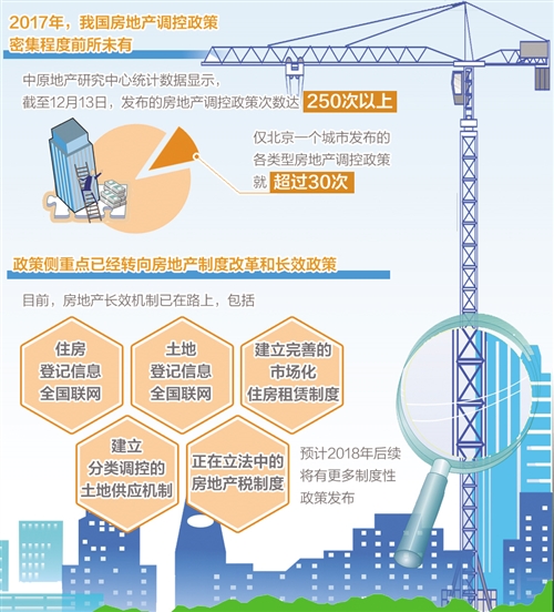 我國在過去20年房地產(chǎn)調(diào)控中,從來沒有一次調(diào)控政策密集發(fā)布程度接近2017年。在“房住不炒”和嚴(yán)控房價的決心下,調(diào)控在短期內(nèi)取得了明顯效果。但歷史上每一輪調(diào)控的經(jīng)驗(yàn)顯示,要保障房地產(chǎn)市場的長期穩(wěn)定運(yùn)行,必須盡快建立調(diào)控長效機(jī)制。住房和城鄉(xiāng)建設(shè)部部長王蒙徽日前表示,“下一步將加快住房制度改革和房地產(chǎn)長效機(jī)制建設(shè),保持房地產(chǎn)市場的平穩(wěn)健康發(fā)展”。無疑,2018年將成為房地產(chǎn)長效機(jī)制取得突破的關(guān)鍵一年。