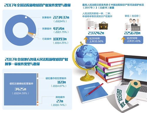 最高人民法院日前發(fā)布的《中國法院知識產(chǎn)權(quán)司法保護狀況(2017年)》(白皮書)披露,2017年,人民法院共新收一審、二審、申請再審等各類知識產(chǎn)權(quán)案件237242件,審結(jié)225678件(含舊存),比2016年分別上升33.50%和31.43%。