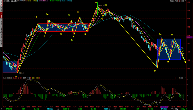 結(jié)合上證指數(shù)5分鐘圖形來看,接下來上證指數(shù)依然存在兩種可能走法,一種就是5分鐘類二買觸發(fā)的反彈,拉回30分鐘76-78中樞。還有一種就是5分鐘繼續(xù)向下,形成5分鐘中樞背馳。