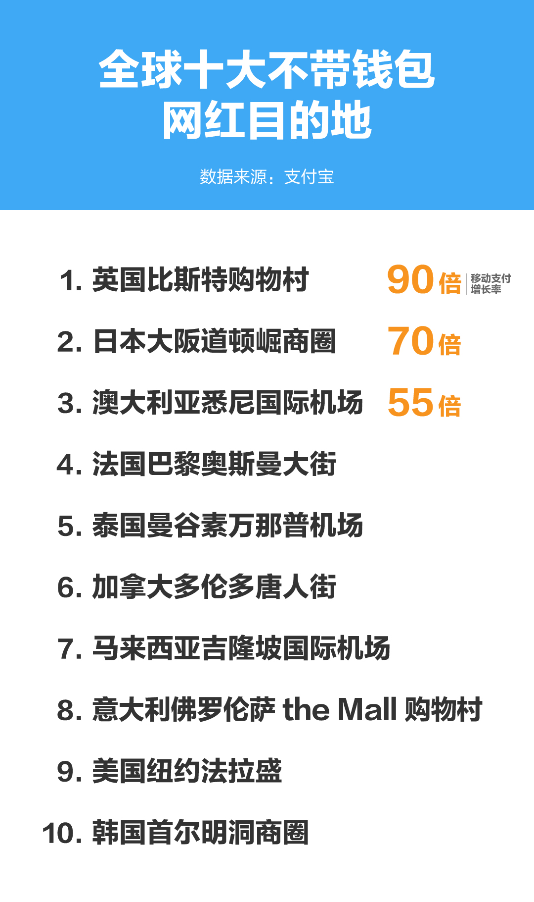 其余進(jìn)入增速最高前十大不帶錢包目的地依次為:日本大阪道頓崛商圈、澳大利亞悉尼國際機(jī)場、法國巴黎奧斯曼大街、泰國曼谷素萬那普機(jī)場、加拿大多倫多唐人街、馬來西亞吉隆坡國際機(jī)場、意大利佛羅倫薩THE MALL購物村、美國紐約法拉盛、韓國首爾明洞商圈。