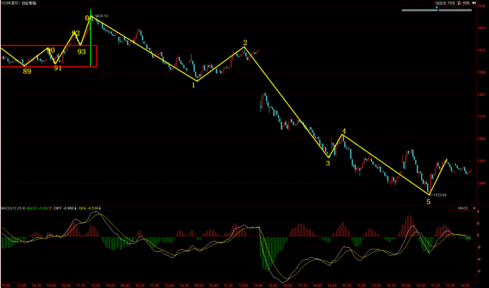 而從上證指數(shù)5分鐘圖來看,指數(shù)通過1分鐘不斷延伸,目前一個(gè)5分鐘下跌中樞已經(jīng)構(gòu)筑完畢,接下來我們需要關(guān)注5分鐘二買。如果是中樞無背馳終結(jié),那么就需要關(guān)注5分鐘三買。