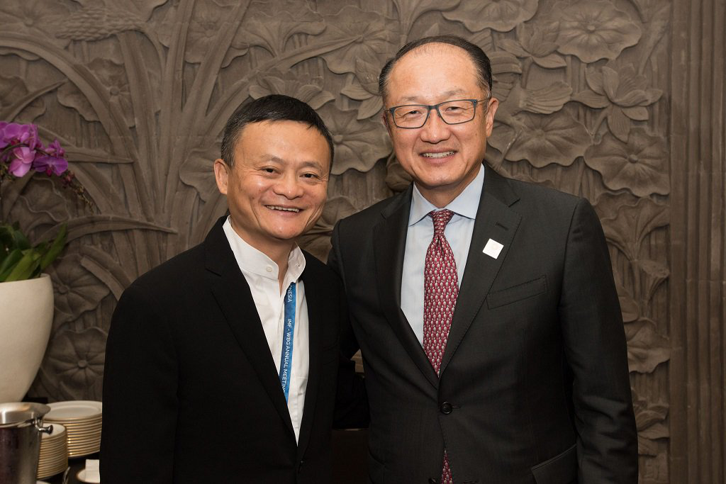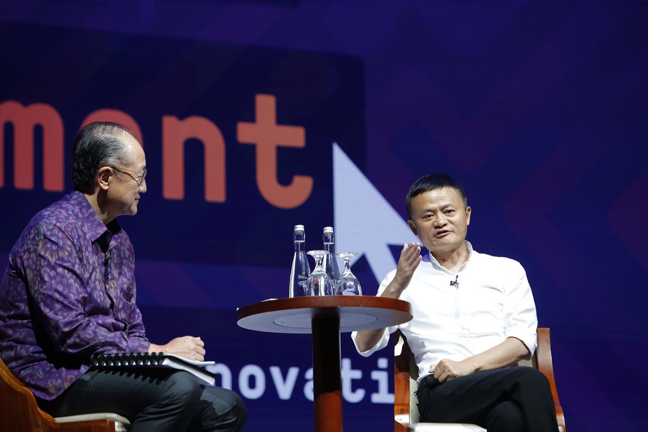 世界銀行行長金墉和阿里巴巴董事局主席馬云進行“數字平臺和創(chuàng)新如何改變發(fā)展中國家未來”的對話