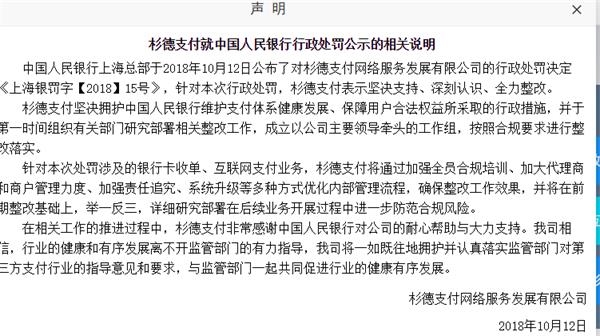 當(dāng)日,杉德支付官網(wǎng)發(fā)布聲明稱,針對(duì)本次行政處罰,杉德支付表示堅(jiān)決支持、深刻認(rèn)識(shí)、全力整改。