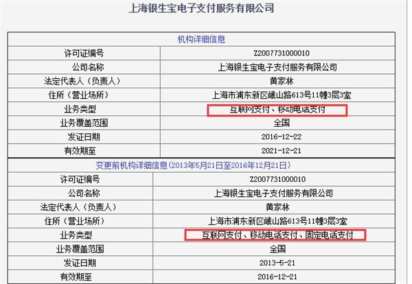 公開信息顯示,上海銀生寶電子支付服務(wù)有限公司成立于2006年5月30日。在2016年12月20日,上海銀生寶電子支付服務(wù)有限公司成功續(xù)展《支付業(yè)務(wù)許可證》,支付業(yè)務(wù)類型包括互聯(lián)網(wǎng)支付和移動(dòng)電話支付業(yè)務(wù),業(yè)務(wù)范圍全國(guó)。但其在2016年12月22日通過續(xù)展時(shí),主動(dòng)終止了固定電話支付業(yè)務(wù)。