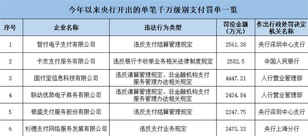 隨著杉德支付2473萬的罰單公布,今年央行已開出六張單筆金額超千萬的巨額支付罰單,且每張?zhí)幜P金額均高于2000萬元。