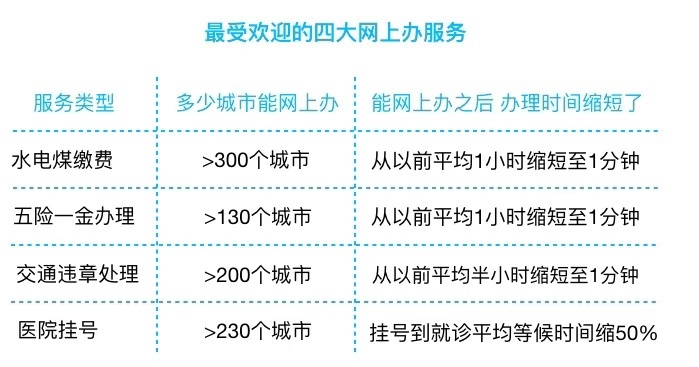 現(xiàn)在能全國超過300個(gè)城市,有100多類服務(wù)實(shí)現(xiàn)了網(wǎng)上辦理,老百姓常用的熱門服務(wù)中,超過一半開始能夠網(wǎng)上辦理。其中水電煤繳費(fèi)、五險(xiǎn)一金的查詢與提取、交通違章信息查詢和處理、醫(yī)院遠(yuǎn)程掛號是老百姓使用最多,最歡迎的四大服務(wù)。