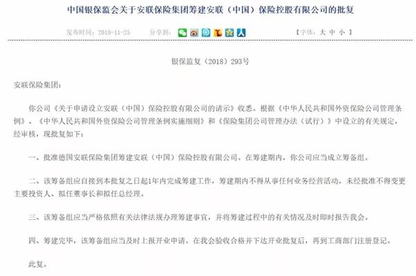 安聯(lián)集團表示,預計安聯(lián)(中國)保險控股將在2019年正式成立,并將在中國相關監(jiān)管機構的指導和支持下,積極完成公司設立所需的各項籌備工作。作為100%外資的保險控股公司,安聯(lián)集團將依托中國政府近期出臺的一系列擴大對外開放、鼓勵外資金融機構擴大在華投資的政策,提升安聯(lián)集團在中國擴大投資和發(fā)展的戰(zhàn)略靈活性。