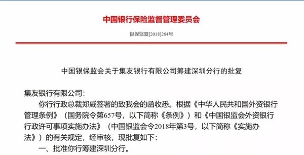 集友銀行1947年在香港注冊開業(yè),是香港第39家領有執(zhí)照的銀行。在對集友銀行的批文中,銀保監(jiān)會要求:自該行接到批文之日起15日內(nèi)到屬地銀行保險監(jiān)督管理機構領取開業(yè)申請表,并按有關規(guī)定開展深圳分行的籌建工作。