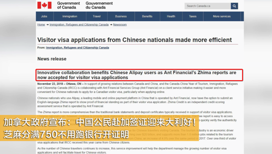 近日,加拿大移民部(IRCC)在官網(wǎng)對(duì)外宣布:現(xiàn)在開始,中國游客可以自主選擇提交芝麻信用簽證報(bào)告,用作財(cái)務(wù)及履約能力證明,“這讓中國公民更便捷地去申請(qǐng)加拿大簽證”。