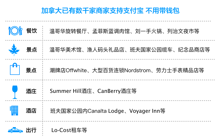 來自加拿大統(tǒng)計(jì)局的數(shù)據(jù)顯示,中國已位列加拿大第三大入境客源市場。目前,加拿大已有數(shù)千家商家支持支付寶消費(fèi),包括了餐飲、住宿、景點(diǎn)、交通等各領(lǐng)域,覆蓋了眾多旅游勝地:多倫多、溫哥華、班夫國家公園等。