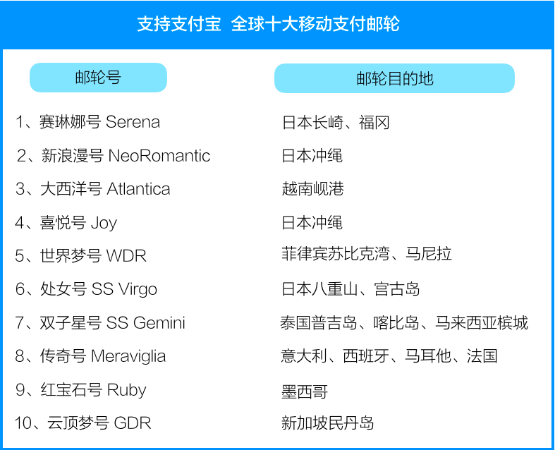 不僅是陸地商圈,支付寶表示,今年春節(jié),「海上目的地」也首次成規(guī)模接入移動支付:包括日本沖繩、馬來西亞沙巴等在內(nèi)的十大海島成為首批接入移動支付的海島,而中國母港出發(fā)的所有郵輪,目前也都已接入移動支付,以方便游客的手機(jī)出游。