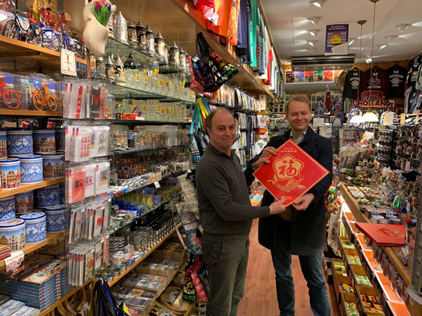 荷蘭阿姆斯特丹一家紀(jì)念品店內(nèi)老板展示“!弊滞扑]中國游客“掃!。