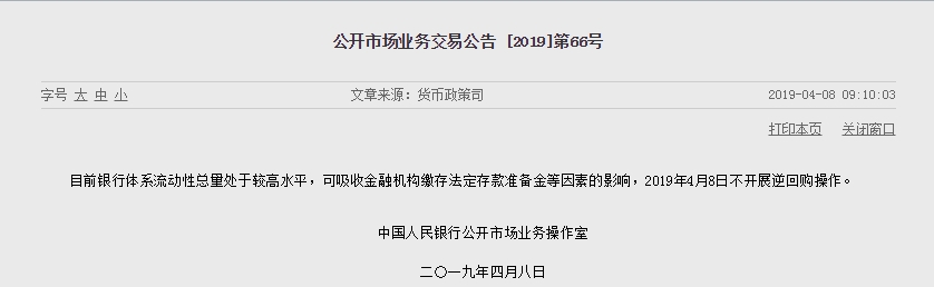 4月8日,中國央行公開市場不開展無逆回購操作,為連續(xù)第13日暫停逆回購操作。當日無逆回購到期。“目前銀行體系流動性總量處于較高水平,可吸收金融機構(gòu)繳存法定存款準備金等因素”,央行在公告中這樣解釋。