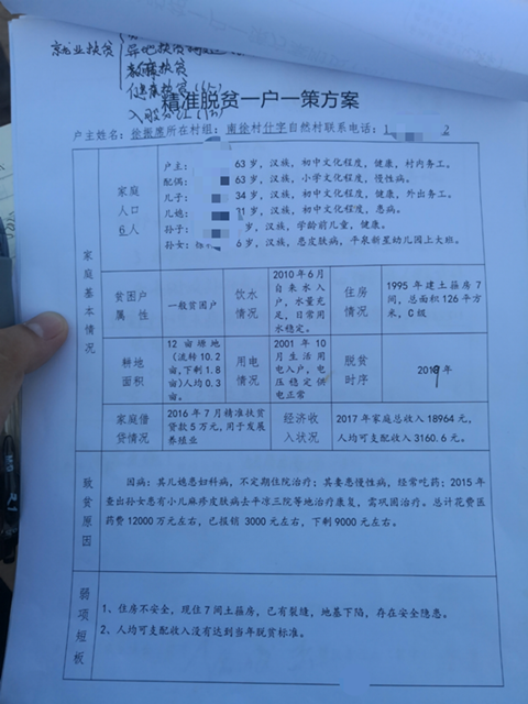 央廣網(wǎng)慶陽7月8消息(記者 王曉蕾)“其妻患慢性病,經(jīng)常吃藥;2015年查出孫女患有小兒麻疹皮膚病,需鞏固治療,總計花費醫(yī)藥費12000元……”在甘肅省慶陽市鎮(zhèn)原縣平泉鎮(zhèn)村民徐振席家的墻上,掛著一本薄薄的“精準脫貧一戶一策方案”,里面密密麻麻詳細記錄了他的家庭基本情況、致貧原因、弱項短板、扶貧措施以及由幫扶干部為他們家制定的脫貧路徑和時間表。