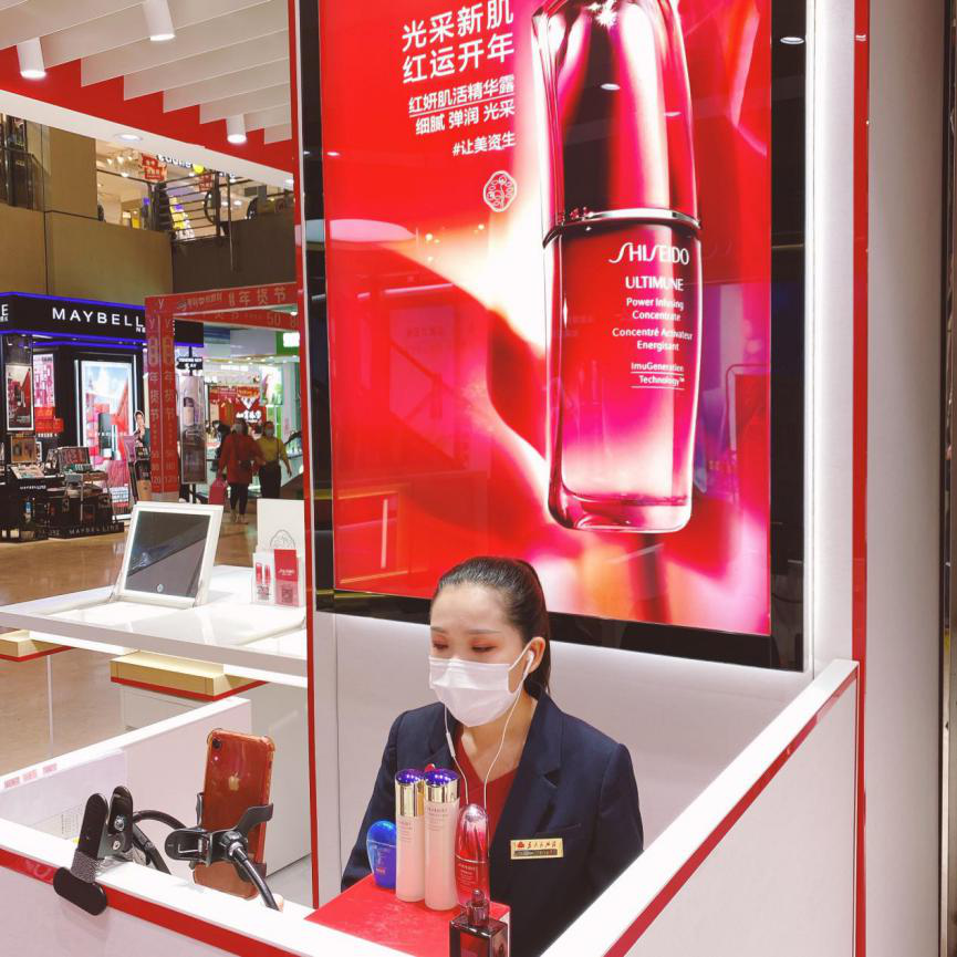 3月23日,仙桃銀泰資生堂導(dǎo)購(gòu)余婉君在柜臺(tái)直播。