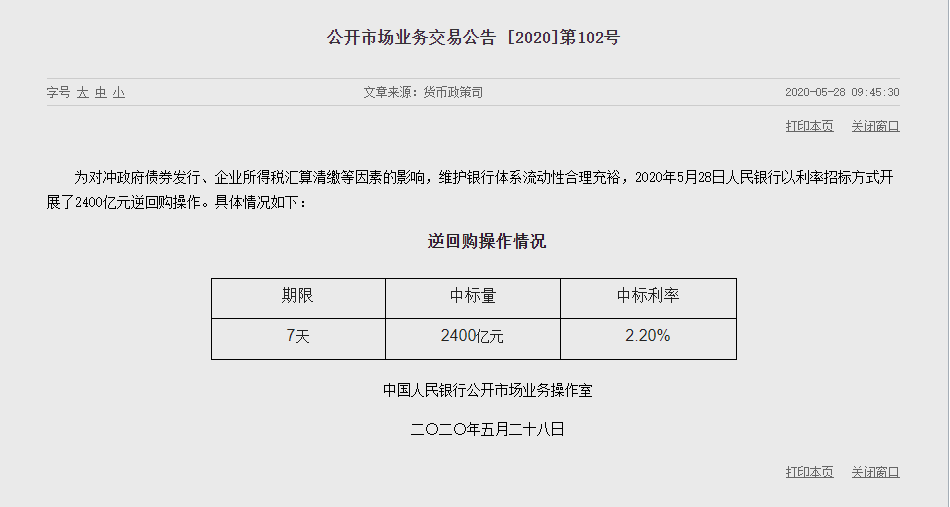 央行解釋稱,開展2400億元逆回購操作是為對沖政府債券發(fā)行、企業(yè)所得稅匯算清繳等因素的影響,維護(hù)銀行體系流動性合理充裕。此次中標(biāo)利率依然與上次持平,仍為2.20%,期限為7天。