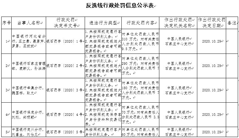 除了上述機(jī)構(gòu),公示表顯示,因中國郵政儲(chǔ)蓄銀行石家莊市分行及有關(guān)負(fù)責(zé)人未按照規(guī)定履行客戶身份識(shí)別義務(wù),監(jiān)管部門對(duì)單位處罰款126萬元,對(duì)兩位有關(guān)責(zé)任人分別處罰款3.4萬元;因上海浦東發(fā)展銀行石家莊分行及有關(guān)負(fù)責(zé)人未按照規(guī)定履行客戶身份識(shí)別義務(wù),監(jiān)管部門對(duì)單位處罰款100萬元,對(duì)兩位有關(guān)責(zé)任人分別處罰款5萬元。
