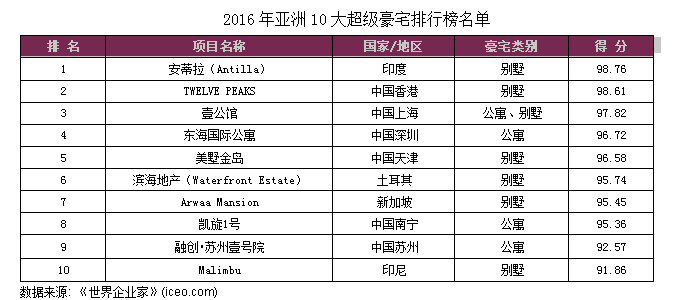 央廣網(wǎng)北京9月26日消息(記者陳璽宇)由世界企業(yè)家集團(tuán)、《世界企業(yè)家》雜志、世界地產(chǎn)研究院主辦、《總裁》雜志社聯(lián)合編制并發(fā)布的2016(第七屆)《亞洲10大超級(jí)豪宅》排行榜今天揭曉,印度首富安巴尼的私人豪宅安蒂拉位居第一,香港山頂豪宅TWELVE PEAKS排名第二,上海壹公館排名第三。中國(guó)大陸其他入選的豪宅項(xiàng)目還有廣東深圳的東海國(guó)際公寓(第四)、天津的美墅金島(第五)、廣西南寧的凱旋1號(hào)(第八)和江蘇蘇州的融創(chuàng)·蘇州壹號(hào)院(第九)。