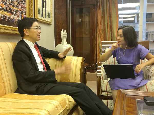 香港中華廠商聯(lián)合會會長李秀恒(左)在香港接受了經(jīng)濟之聲記者馮雅(右)的專訪