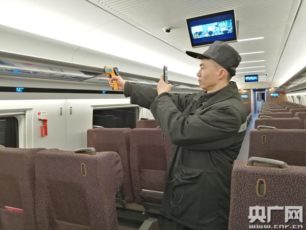 蔡萌菲在車廂內(nèi)巡視,用打溫槍確定車廂內(nèi)溫度,并拍照留存。(央廣記者 佟亞濤 攝)