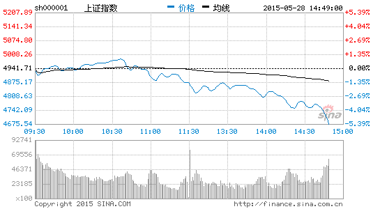 央廣網(wǎng)北京5月28日消息 據(jù)經(jīng)濟之聲《交易實況》報道,早盤,滬指低開高走,再創(chuàng)7年新高,最高達4986.50點,逼近5000點關口,十點半左右滬指高位跳水,權重股走低,題材股沖高回落;午后開盤滬指再度跳水,截止收盤報4620.27點,跌321.45點,跌幅6.50%。兩市成交24206億元,其中滬市成交12479億元,量比1.23,深市成交11727億元,量比1.38。兩市共有超過500只個股跌停,超過2000只個股收跌。