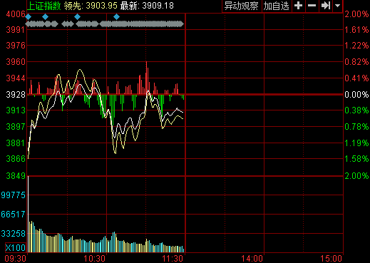 截至午間收盤,滬指跌0.45%,跌17.61點(diǎn),報(bào)3910.3點(diǎn);深成指跌0.38%,跌51.27點(diǎn),報(bào)13271.81點(diǎn);創(chuàng)業(yè)板指跌0.93%,跌25.03點(diǎn),報(bào)2673.89點(diǎn)。
