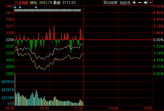 截止午盤(pán),滬指報(bào)3172.03點(diǎn),跌33.96點(diǎn),跌幅1.06%。