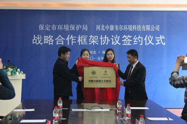 保定市環(huán)保局局長肖寶元(左)、中康韋爾總經(jīng)理陳龍(右)分別代表雙方在戰(zhàn)略合作框架協(xié)議書上簽字并為“智能環(huán)保聯(lián)合實驗室”揭牌。
