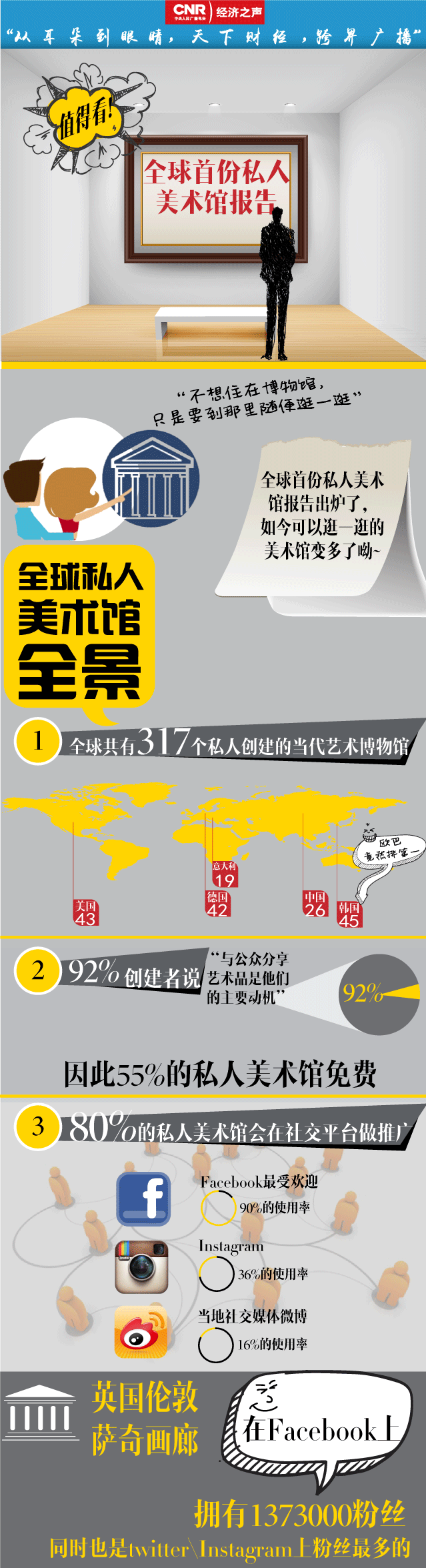 央廣網(wǎng)北京3月30日消息 據(jù)經(jīng)濟(jì)之聲《天下財(cái)經(jīng)》報(bào)道,全球首份私人美術(shù)館報(bào)告出爐了,如今可以逛一逛的美術(shù)館變多了。全球共有317個(gè)私人創(chuàng)建的當(dāng)代藝術(shù)博物館,92%的創(chuàng)建者說(shuō),與公眾分享藝術(shù)品是他們的主要?jiǎng)訖C(jī)。因此,55%的私人美術(shù)館免費(fèi)。