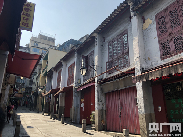 胡景光告訴記者,這里有澳門(mén)保存最完整的古建筑群。如今這里變成美食、手信一條街,四周建筑都已經(jīng)變了模樣,不過(guò)這里依然保留著上百年前的面貌!鞍拈T(mén)的古建筑可能是一棟、兩棟零星分布,這里是僅有的一條街古建筑!