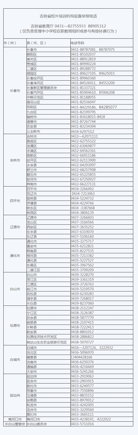 央廣網(wǎng)長(zhǎng)春8月26日消息(記者 郭東隅)為持續(xù)規(guī)范校外培訓(xùn),廣泛發(fā)揮社會(huì)監(jiān)督作用,近日,吉林省教育廳將省、市、縣教育行政部門(mén)監(jiān)督舉報(bào)電話向社會(huì)公布。如發(fā)現(xiàn)校外培訓(xùn)機(jī)構(gòu)或中小學(xué)校在職教師有以下行為,請(qǐng)實(shí)名舉報(bào)。