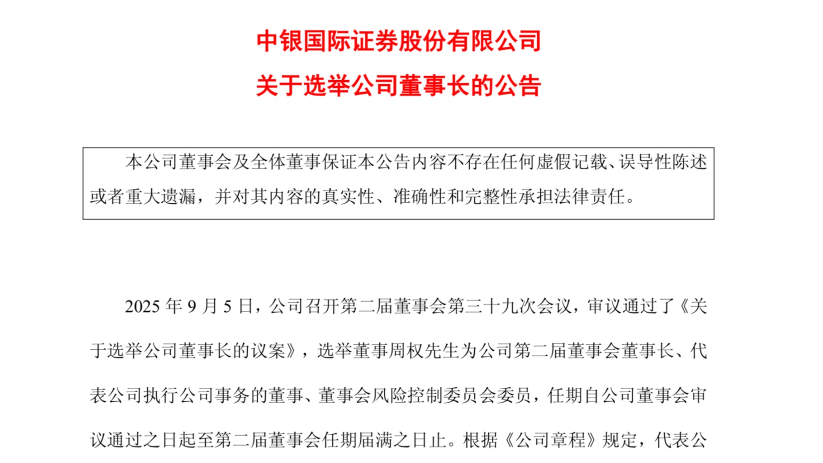 中銀證券近日發(fā)布董事長變更公告,選舉周權(quán)為董事長。