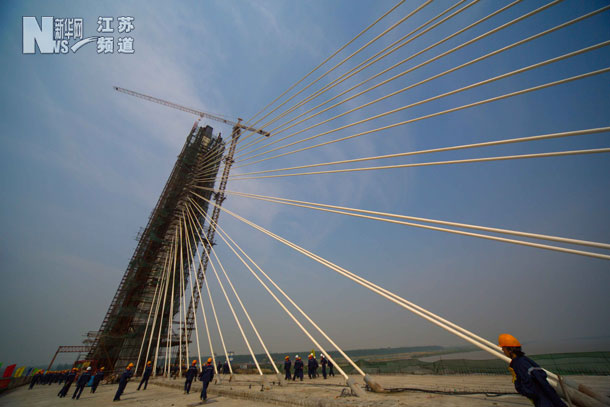 如皋長(zhǎng)江大橋建設(shè)者從85米高的主塔及斜拉索前走過(guò)。