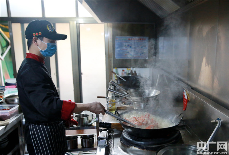 2020年3月18日,江西省吉安市吉水縣一家餐飲店蝦味飄香,廚師正在精心烹調(diào)小龍蝦。