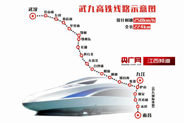 武九高鐵起于湖北武漢,終抵江西九江,設(shè)計時速250公里,全長224公里。全線設(shè)有武漢站、花山南站、左嶺站、葛店南站、華容南站、鄂州站、鄂州東站、花湖站、黃石北站、大冶北站、白沙鋪站、陽新站、楓林站、瑞昌西站、柴桑站、廬山站和九江站等17個車站。