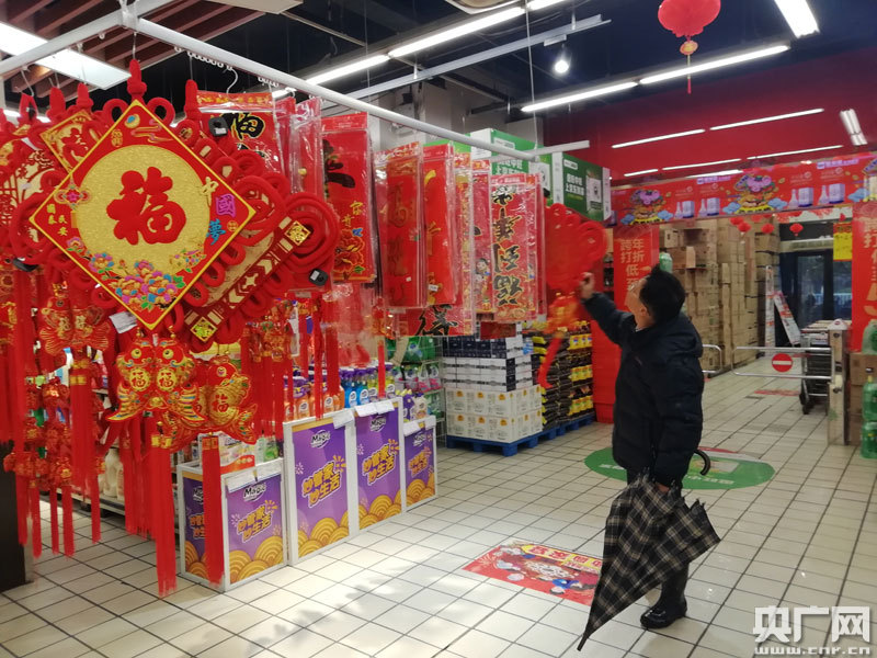 除了購買年貨禮盒外,還有一些新年特色的物件等,也是年貨的首選之物,而大多數市民都會首選對聯(lián)、紅燈籠和“!弊謷祜椀龋@些物件不僅是春節(jié)的傳統(tǒng)象征,更能體現出老人們對明年紅火日子的企盼!敖裉祀S老伴來超市主要是為了買春聯(lián),也預祝明年能夠像對聯(lián)上說的一樣,好運不斷!崩先诵χf道。