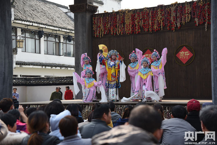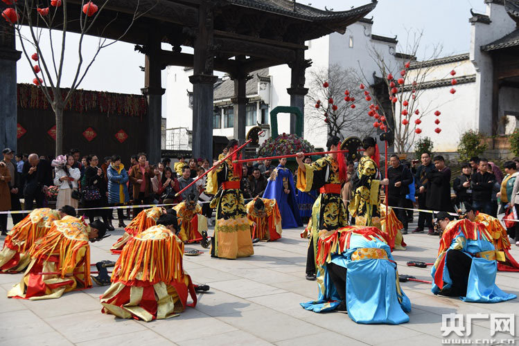 婺源充分發(fā)揮豐富的非遺文化資源優(yōu)勢,打造極具特色的“演藝小鎮(zhèn)”,推動旅游文化產(chǎn)業(yè)大發(fā)展,吸引了眾多游客前來觀看。3月11日,游客在婺源夢里老家演藝小鎮(zhèn)欣賞極具當(dāng)?shù)靥厣膰壹壏沁z項目——儺舞和徽劇表演。(央廣網(wǎng)發(fā) 通訊員單長華攝)