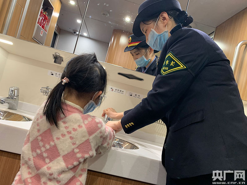“口罩不能隨便丟,洗手姿勢要正確,病從口入要切記!睆哪喜鏖_往北京D733次列車上,列車長、共產(chǎn)黨員周佳鑫正在給旅客宣傳防疫小知識。