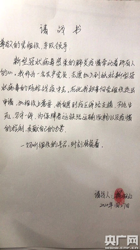 “我作為一名共產(chǎn)黨員,自愿加入到抵抗新型冠狀病毒的防控戰(zhàn)‘疫’中去。”1月27日,南昌客運段D736次列車員楊躍紅寫下了一封請戰(zhàn)書。