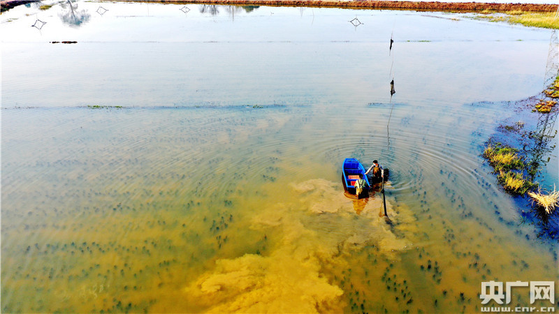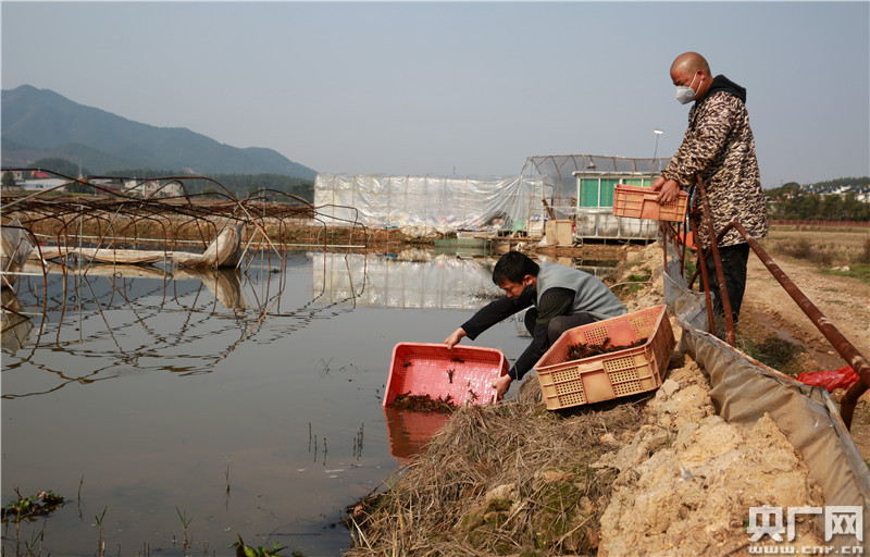 2020年2月26日,江西省吉安市吉水縣文峰鎮(zhèn)葛山村益農(nóng)藕蝦共作基地,養(yǎng)殖戶劉志回將運(yùn)回的蝦苗投放藕池。